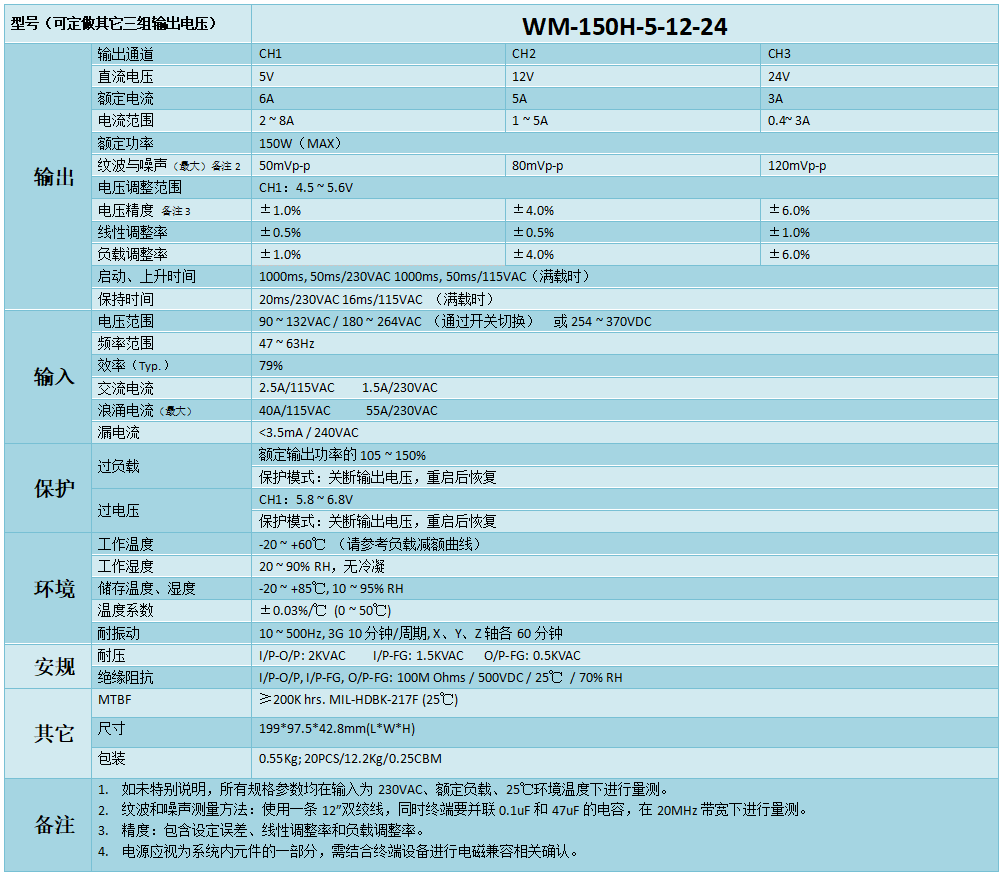 1.如未特别说明,所有规格参数均在输入为230VAC、额定负载、25℃环境温度下进行量测。